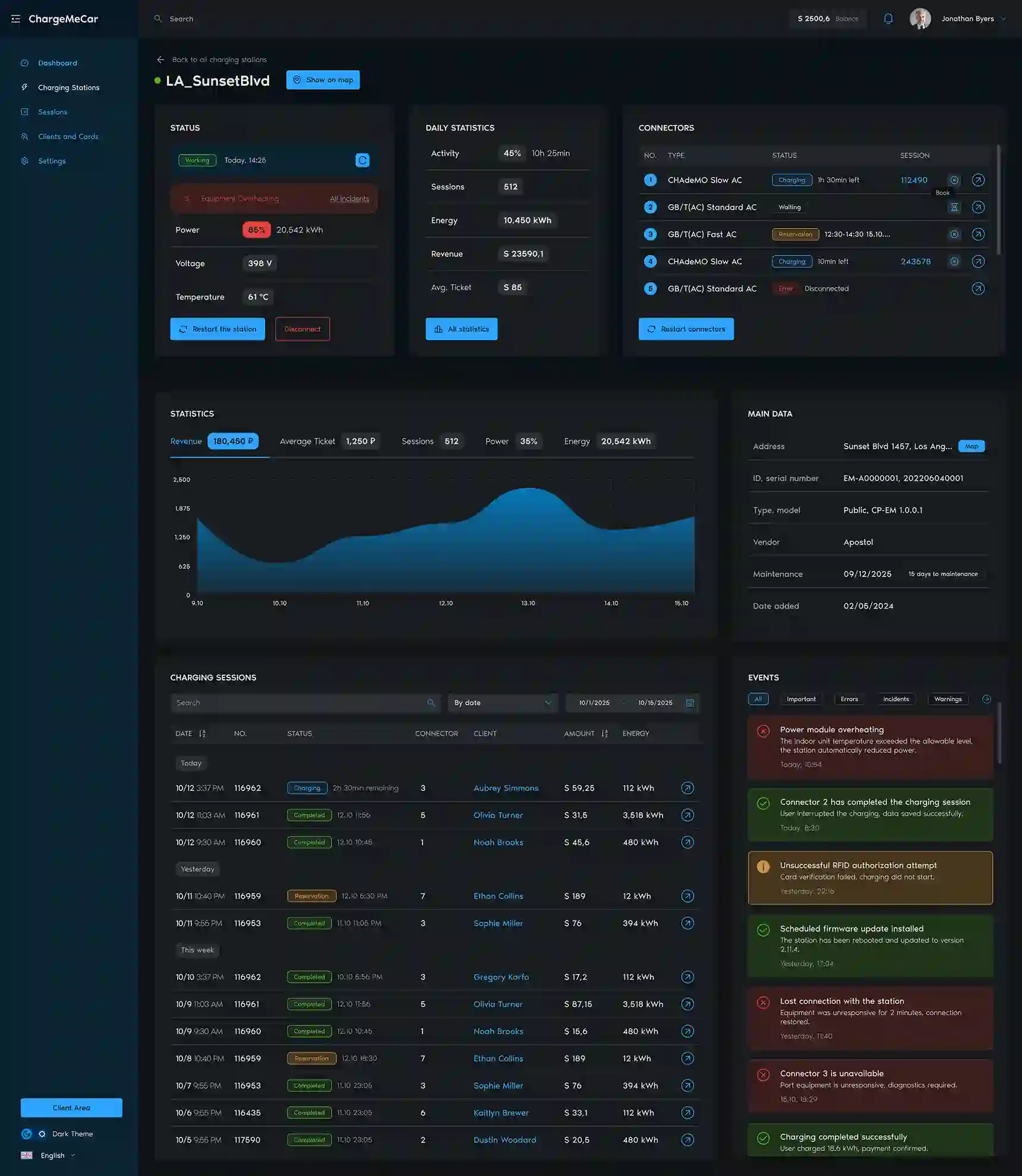 The platform allows real-time remote start and stop of charging, change statuses, and manage connectors. Key equipment and network load parameters are visible, while notifications and logs help quickly respond to any incidents.