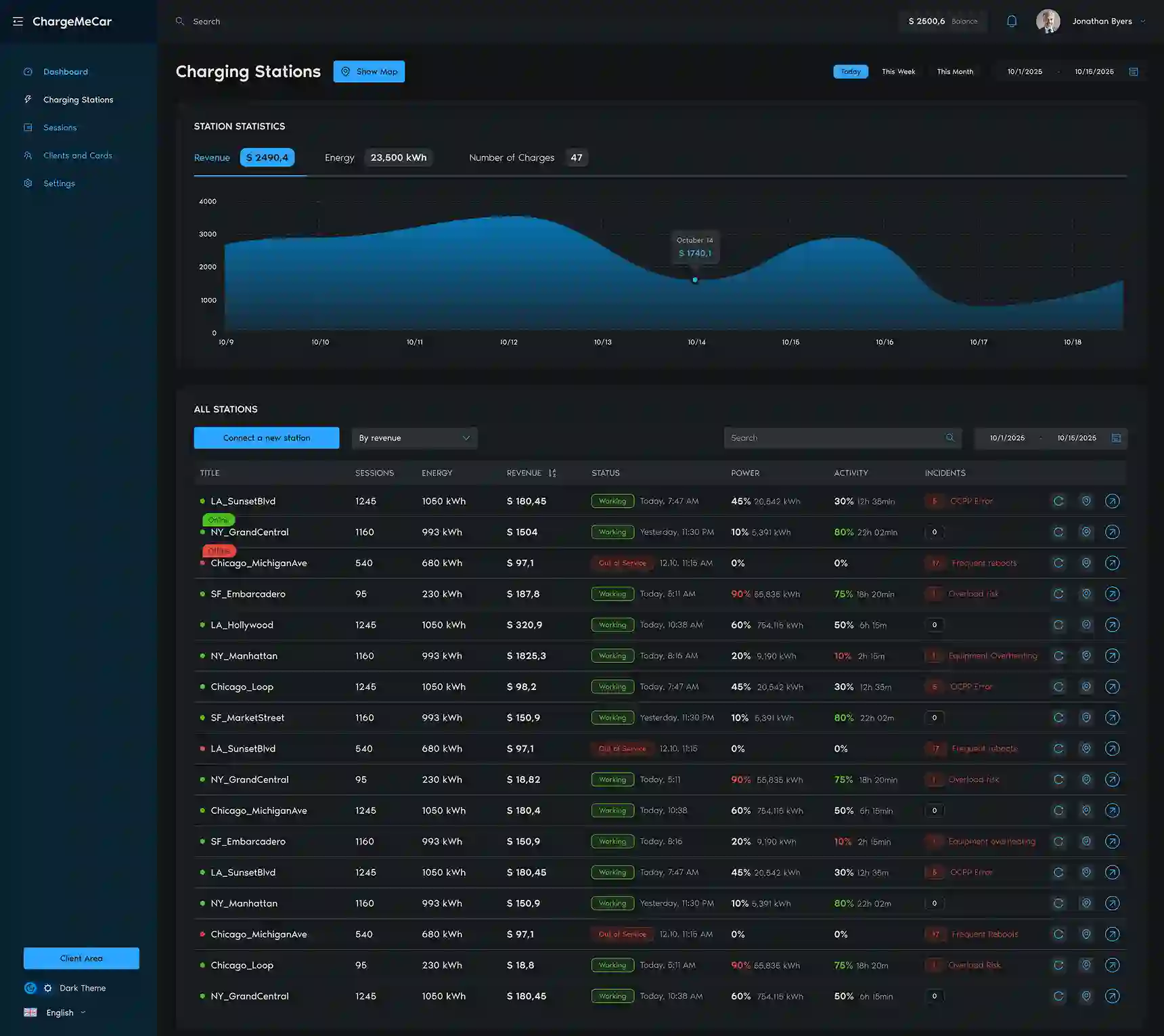 Dashboards show historical data, usage statistics, and various charging network parameters. The system generates analytical reports, helps track performance metrics, and supports data export for external systems.